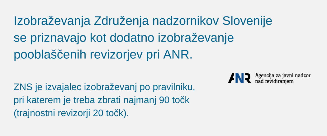 Izobraževanja Združenja nadzornikov Slovenije se tudi po novem pravilniku priznajo kot dodatno izobraževanje pooblaščenih revizorjev pri ANR. ZNS se uvršča med izvajalce izobraževanj, določene s pravilnikom, pri katerih morajo pooblaščeni revizorji zbrati najmanj 90 točk izobraževanja (trajnostni revizorji najmanj 20 točk).