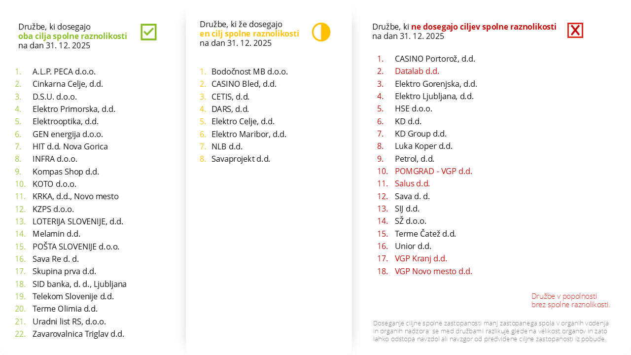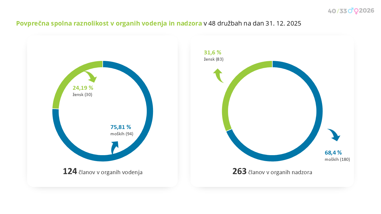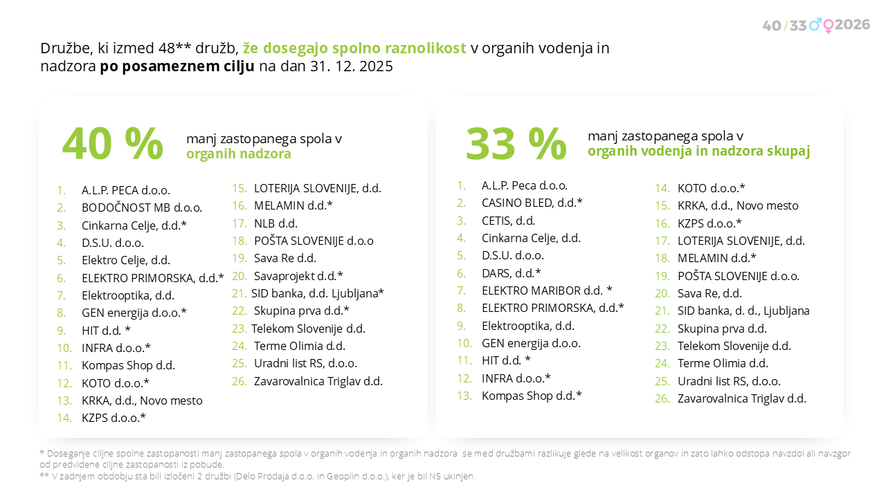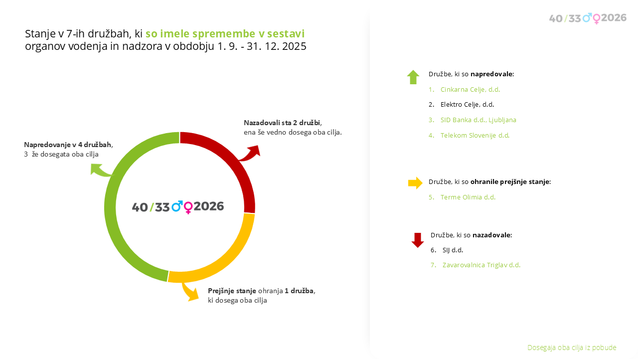 V obdobju 1. 9. do 31. 12. 2025 je imelo 7 družb priložnost za spremembe v sestavi teh organov. Predstavljamo njihovo doseganje ciljev spolne zastopanosti iz pobude 40/33/2026: