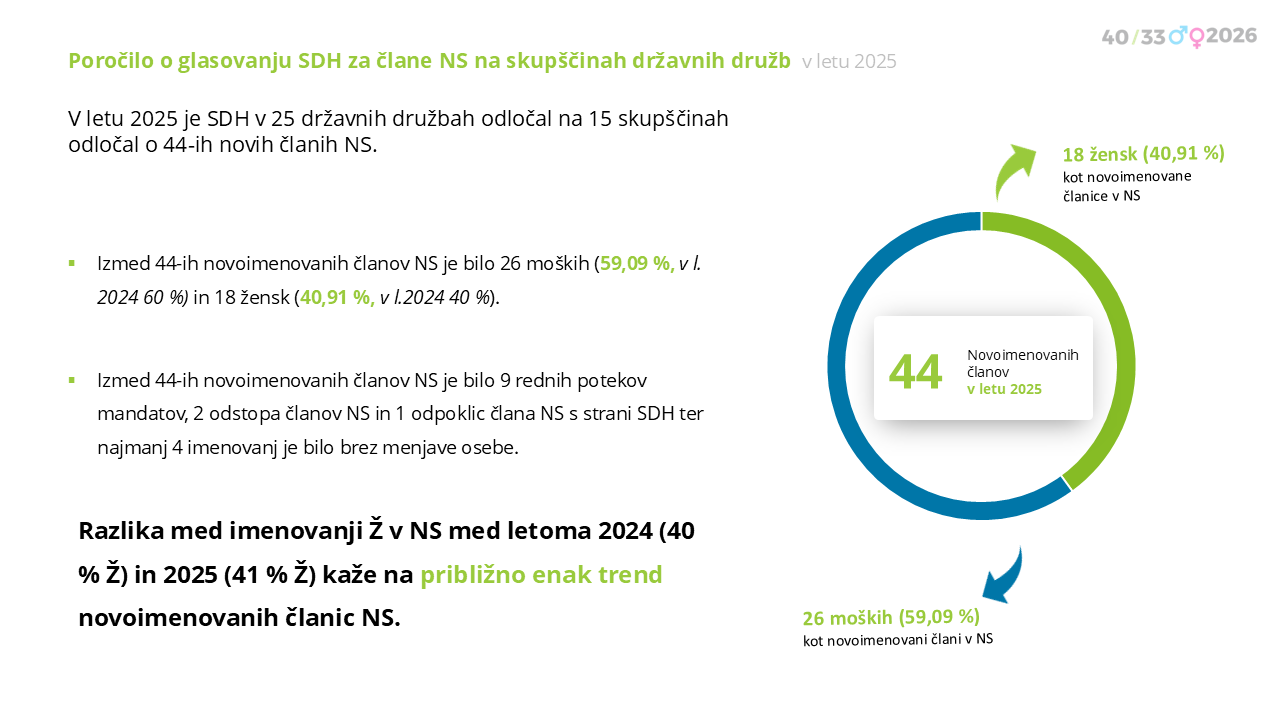 Izmed 44-ih novoimenovanih članov NS je bilo 26 moških (59 %, v l. 2024 60 %) in 18 žensk (41 %, v l.2024 40 %). Razlika med imenovanji žensk v NS med letoma 2024 in 2025 zanje kaže na približno enak trend novoimenovanih članov/članic NS.