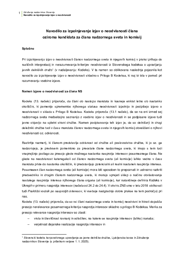 Pri izpolnjevanju izjav o neodvisnosti članov nadzornega sveta in njegovih komisij v praksi prihaja do različnih interpretacij in nerazumevanja kriterijev neodvisnosti iz Slovenskega kodeksa o upravljanju javnih delniških družb (v nadaljevanju: Kodeks). V ta namen so oblikovana naslednja pojasnila kot navodilo za izpolnjevanje izjav o neodvisnosti skladno s Prilogo B Kodeksa, ki naj bi bila v pomoč pri razumevanju vsebine izjave.