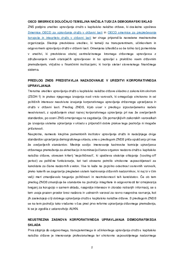 Združenje nadzornikov Slovenije (ZNS) podaja svoje stališče glede predloga Zakona o nacionalnem demografskem skladu (ZNDS), in sicer v delu, ki se nanaša na upravljanje sklada in družb s kapitalsko naložbo države (oziroma skladno s predlogom zakona družb s kapitalsko naložbo sklada). Predlog ZNDS, katerega namen je omiliti povečanje javnofinančnih izdatkov za financiranje obveznega pokojninskega in invalidskega zavarovanja, poleg naslavljanja svojega temeljnega cilja korenito spreminja tudi trenutno uveljavljeni sistem upravljanja družb s kapitalsko naložbo države. Predlog ne predvideva ustanovitve demografskega sklada kot neodvisnega avtonomnega rezervnega sklada, temveč uvaja podlago za vzpostavitev novega, centraliziranega krovnega upravljavca državnega premoženja, v katerega se bo preoblikoval SDH in v katerem bodo združeni tudi preostali upravljavci državnih naložb. Zato bi moral predlog zakona pri ubeseditvi sistema korporativnega upravljanja demografskega sklada zasledovati najmanj standarde upravljanja, ki veljajo za banke in zavarovalnice, katerih upravljavec bo sklad nenazadnje tudi bil. Nasprotno, predlog opušča najpomembnejše, z zakonom in prakso že uveljavljene institute preglednega in učinkovitega upravljanja, kot so kadrovski postopek in kriteriji za imenovanje članov nadzornega sveta demografskega sklada in članov organov nadzora družb v upravljanju ter področje integritete, s čimer predstavlja tako na področju korporativnega upravljanja sklada kot na področju korporativnega upravljanja družb v njegovem upravljanju velik korak nazaj.