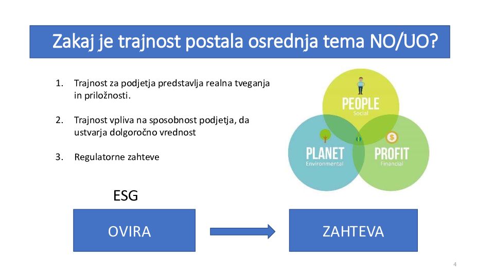 Regulatorni okvir za evropsko trajnostno preobrazbo: Zakaj je trajnost oz. ESG postala osrednja tema nadzornih/upravnih odborov?, Akcijski načrt trajnostne rasti, EU taksonomija, Evropska direktiva za trajnostno poročanje (CSRD), Evropski zeleni dogovor, Program Fit for 55, Trajnostni razvoj – kontrolna vprašanja za NS.