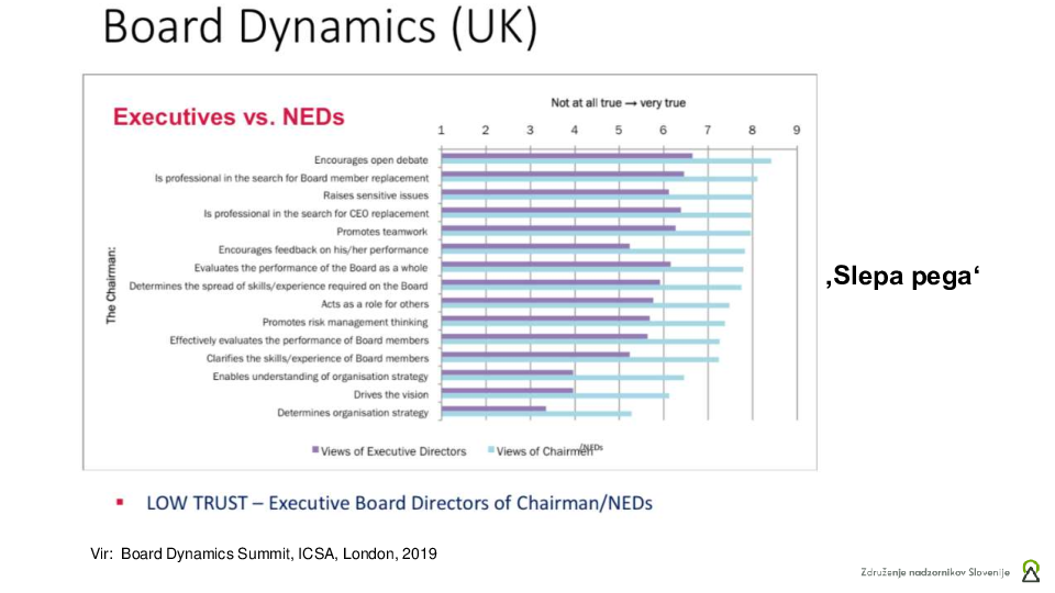 Na webinarju smo predstavili kako do večje dodane vrednosti v postopkih samoocenjevanja NS. V ospredje korporacijskega upravljanja postavljamo temo dodane vrednosti v postopkih samoocenjevanja nadzornih svetov, zato smo v lanskem letu pripravili priročnik Za več dodane vrednosti pri samoocenjevanju nadzornega sveta - praktične izkušnje in izzivi, ki je v pomoč pri uspešni zasnovi teh postopkov. Potem, ko se je ta institut upravljanja z uporabo ZNS metodologije in matrike za samoocenjevanje nadzornega sveta že dodobra uveljavil v praksi, je postal največji izziv nadzornih svetov v preseganju samodejnega izpolnjevanja matrik (t.i. box-ticking), strokovnosti vodenja in objektivnosti teh postopkov, nekritične in neambiciozne razprave o rezultatih samoocenjevanja, ki ne prinašajo sprememb.