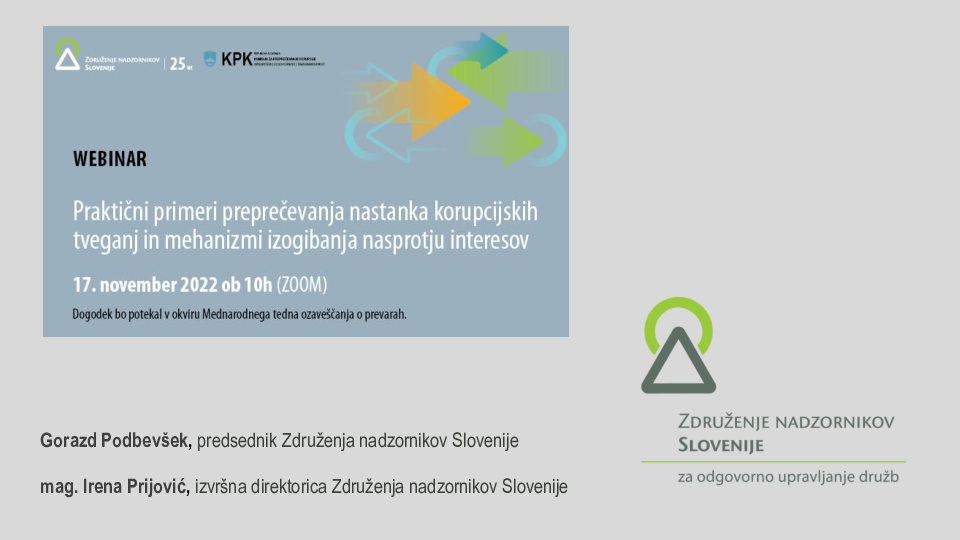 Združenje nadzornikov Slovenije (ZNS) in Komisija za preprečevanje korupcije (Komisija) v tokratnem strokovnem sodelovanju v okviru Mednarodnega tedna ozaveščanja o prevarah naslavljata teme krepitve mehanizmov, ki zmanjšujejo tveganja, povezana s prehodi med različnimi upravljavskimi funkcijami (veriženje in kopičenje funkcij, obdobje ohlajanja za politične funkcionarje), prehodov med javnim in zasebnim sektorjem (vrtljiva vrata) ter drugih okoliščin, ki povzročajo nastanek nasprotja interesov pri izvajanju pristojnosti in opravljanju nalog.