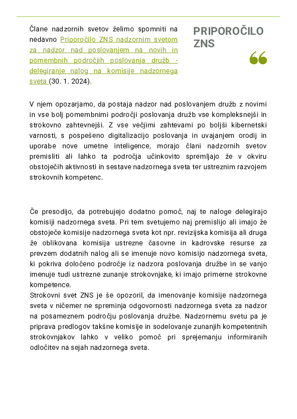 Člane nadzornih svetov želimo spomniti tudi na Priporočilo ZNS nadzornim svetom za nadzor nad poslovanjem na novih in pomembnih področjih poslovanja družb - delegiranje nalog na komisije nadzornega sveta (30. 1. 2024).