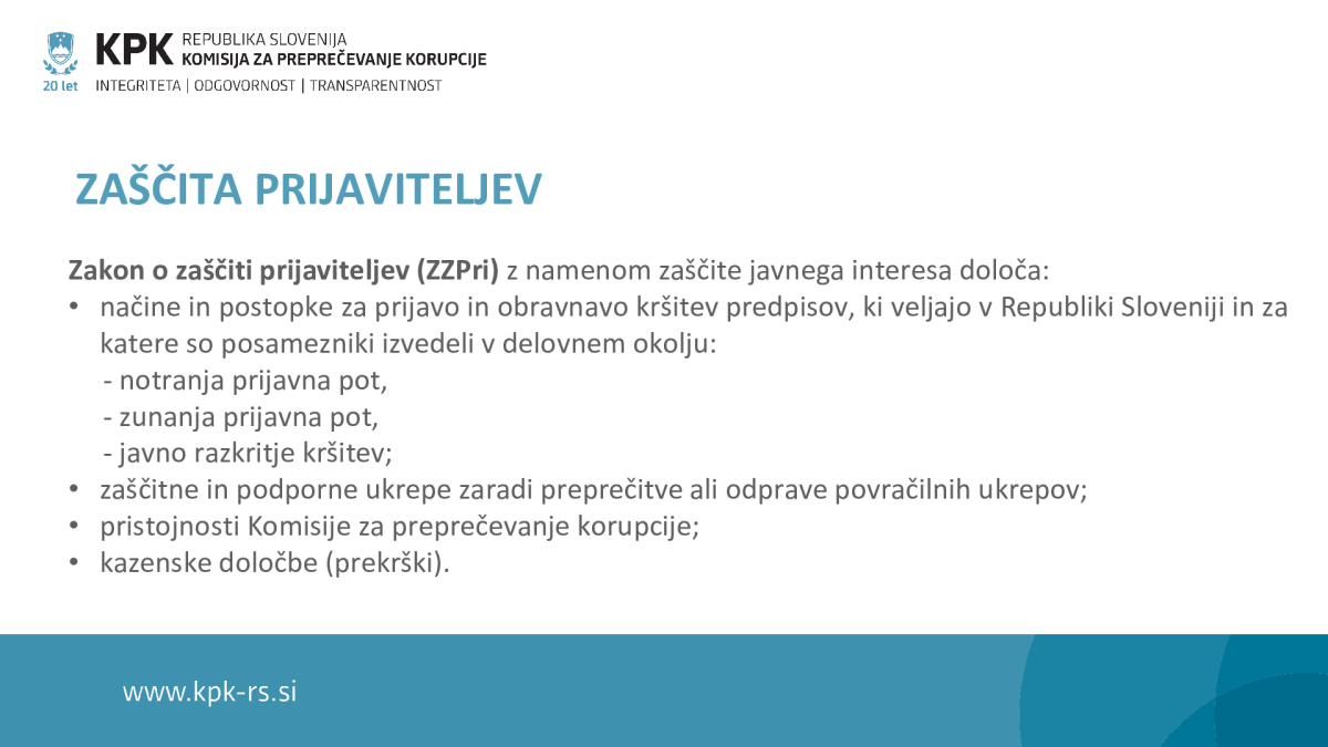 Tak vpliv je nezakonit, sami pa moramo razumeti, kakšni koraki so nam na voljo, da varujemo svojo integriteto in se zaščitimo pred morebitnimi povračilnimi ukrepi ob prijavi takšnih ravnanj in razkritju na nadzornem svetu. V zvezi s tem bomo od Komisije za preprečevanje korupcije izvedeli več o določbah Zakona o zaščiti prijaviteljev, ki tudi člane nadzornih svetov obravnava kot prijavitelje (žvižgače), zaščitnih ukrepih, ki so nam na voljo, ter načinu obravnave prijave, če to podate neposredno Komisiji. V primeru izvajanja pritiska ali suma nedovoljenega vplivanja nad članom nadzornega sveta ali članom organa vodenja družbe s kapitalsko naložbo države, v kateri ima SDH (v vlogi upravljavca) večinski delež ali prevladujoč vpliv, morajo v skladu s 57. členom ZSDH-1 člani nadzornih svetov in uprav tovrstna ravnanja prijaviti pooblaščencu za skladnost poslovanja in integriteto SDH. Prijavo lahko predložijo tudi neposredno Komisiji za preprečevanja korupcije.