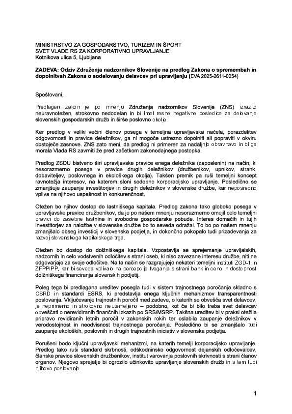 Odziv Združenja nadzornikov Slovenije na predlog Zakona o spremembah in dopolnitvah Zakona o sodelovanju delavcev pri upravljanju