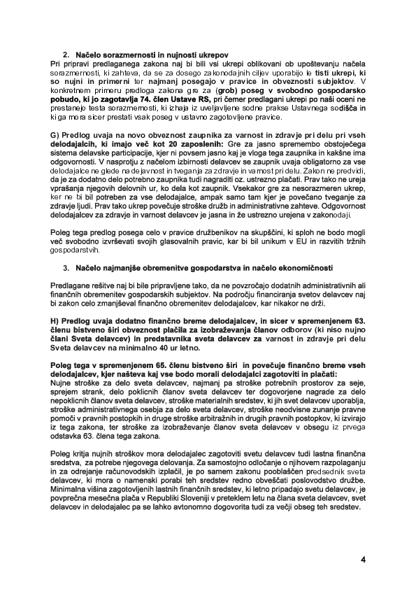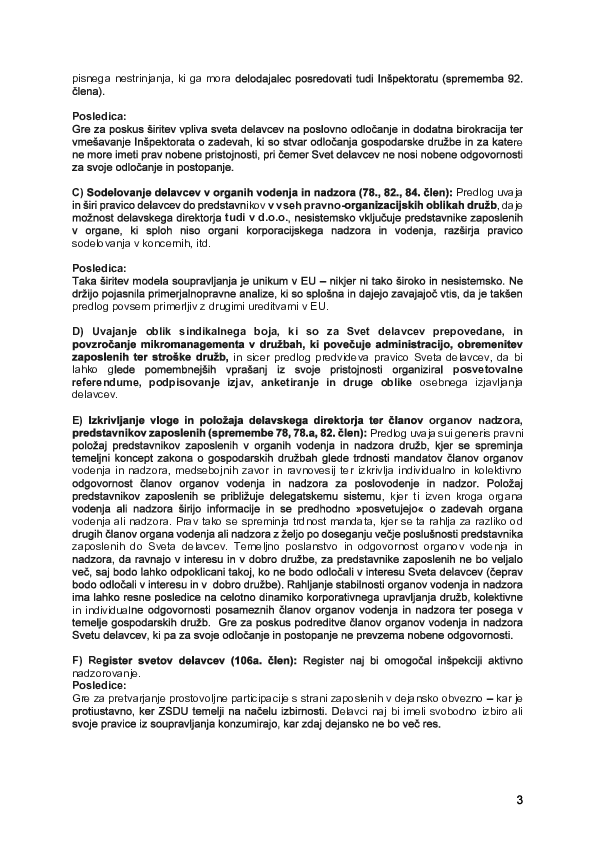 Predlog ZSDU bistveno širi upravljavske pravice enega deležnika (zaposlenih) na način, ki nesorazmerno posega v pravice drugih deležnikov (družbenikov, upnikov, strank, dobaviteljev, poslovnega in ekološkega okolja). Takšen premik pa ruši temeljni koncept ravnotežja interesov, na katerem sloni sodobno korporacijsko upravljanje. Posledično se zmanjšuje zaupanje investitorjev in drugih deležnikov v slovenske družbe, kar neposredno vpliva na njihovo uspešnost in konkurenčnost.