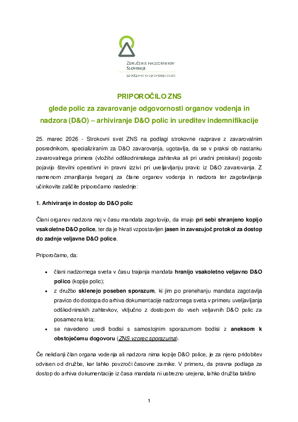 Strokovni svet ZNS na podlagi strokovne razprave z zavarovalnim posrednikom, specializiranim za D&O zavarovanja, ugotavlja, da se v praksi ob nastanku zavarovalnega primera (vložitvi odškodninskega zahtevka ali pri uradni preiskavi) pogosto pojavijo številni operativni in pravni izzivi pri uveljavljanju pravic iz D&O zavarovanja. Z namenom zmanjšanja tveganj za člane organov vodenja in nadzora ter zagotavljanja učinkovite zaščite priporočamo naslednje: