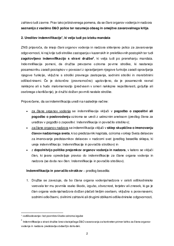 ZNS priporoča, da imajo člani organov vodenja in nadzora sklenjeno polico za zavarovanje odgovornosti, ki naj krije tudi stroške zastopanja v kazenskih in prekrškovnih postopkih ter tudi zagotovljeno indemnifikacijo s strani družbe2, ki velja tudi po prenehanju mandata. Indemnifikacija pomeni, da družba prevzame oziroma povrne stroške, ki nastanejo posamezniku zaradi postopkov v povezavi z opravljanjem njegove funkcije zaradi opravljanja njegove funkcije, vključno s stroški pravnega zastopanja, sodnimi stroški in morebitnimi odškodninami. Če je dokončno (pravnomočno) ugotovljeno, da je posameznik ravnal naklepno ali s hudo malomarnostjo (predvsem v smeri naklepne nepoštenosti, goljufije ali osebnega okoriščanja), je družbi dolžan povrniti nastale stroške.