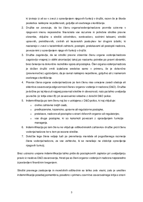 - Indemnifikacija po tem členu naj bo v usklajena z D&O polico, ki naj vključuje: