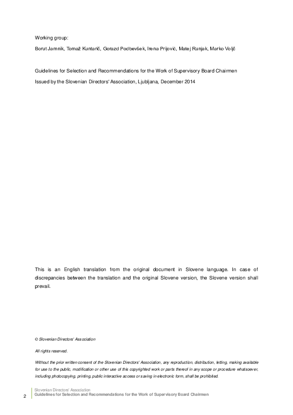 The Guidelines are intended for all supervisory board members as a good practice recommendation for the selection, role, and work of supervisory board chairmen in Slovenia. Provisions of these Guidelines, which exceed the legislative framework, shall not be binding and shall apply by analogy to supervisory board chairmen of all companies with account taken of the special features of an individual company’s operations.