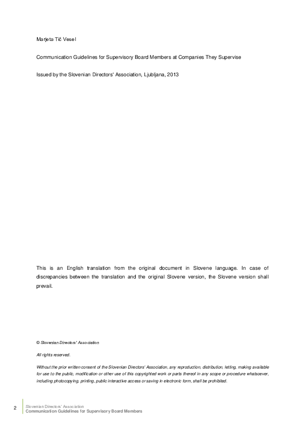 The aim of the Guidelines of the Slovenian Directors' Association is to underscore that media appearance by supervisory board members as individuals are inappropriate when the members do not hold an authorisation issued by the supervisory board for this purpose, or that such appearances are only appropriate under extraordinary circumstances (resignation from the function).